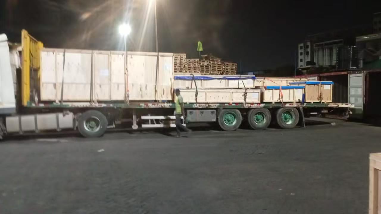 All'arrivo della merce al porto di Tema, Ghana, il ns il team di professionisti ha completato tempestivamente la ricezione e l'ispezione. Per grandi potenze attrezzature, abbiamo effettuato l'ancoraggio e il rinforzo dell'intero processo per prevenire spostamento durante il trasporto via terra. Tutta la merce era completamente coperta teloni laminati impermeabili per resistere alle intemperie e ai danni causati dall'umidità. Ogni mezzo di trasporto era dotato di un modulo di ricevuta standard tracciabilità e verifica dell’intero processo.